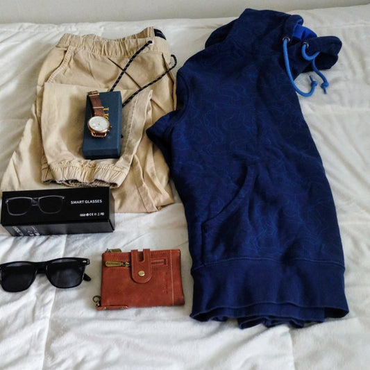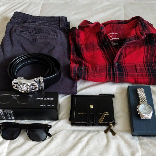 Pantalón de hombre y reloj y camisa y accesorios.