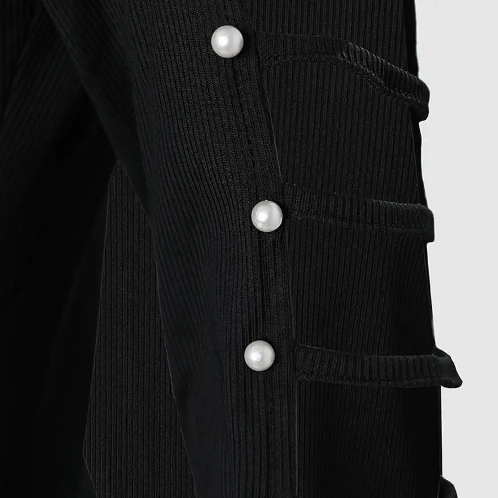 Features a round neck, long sleeves, heart-like metal bead decoration, and a sophisticated hollow design.