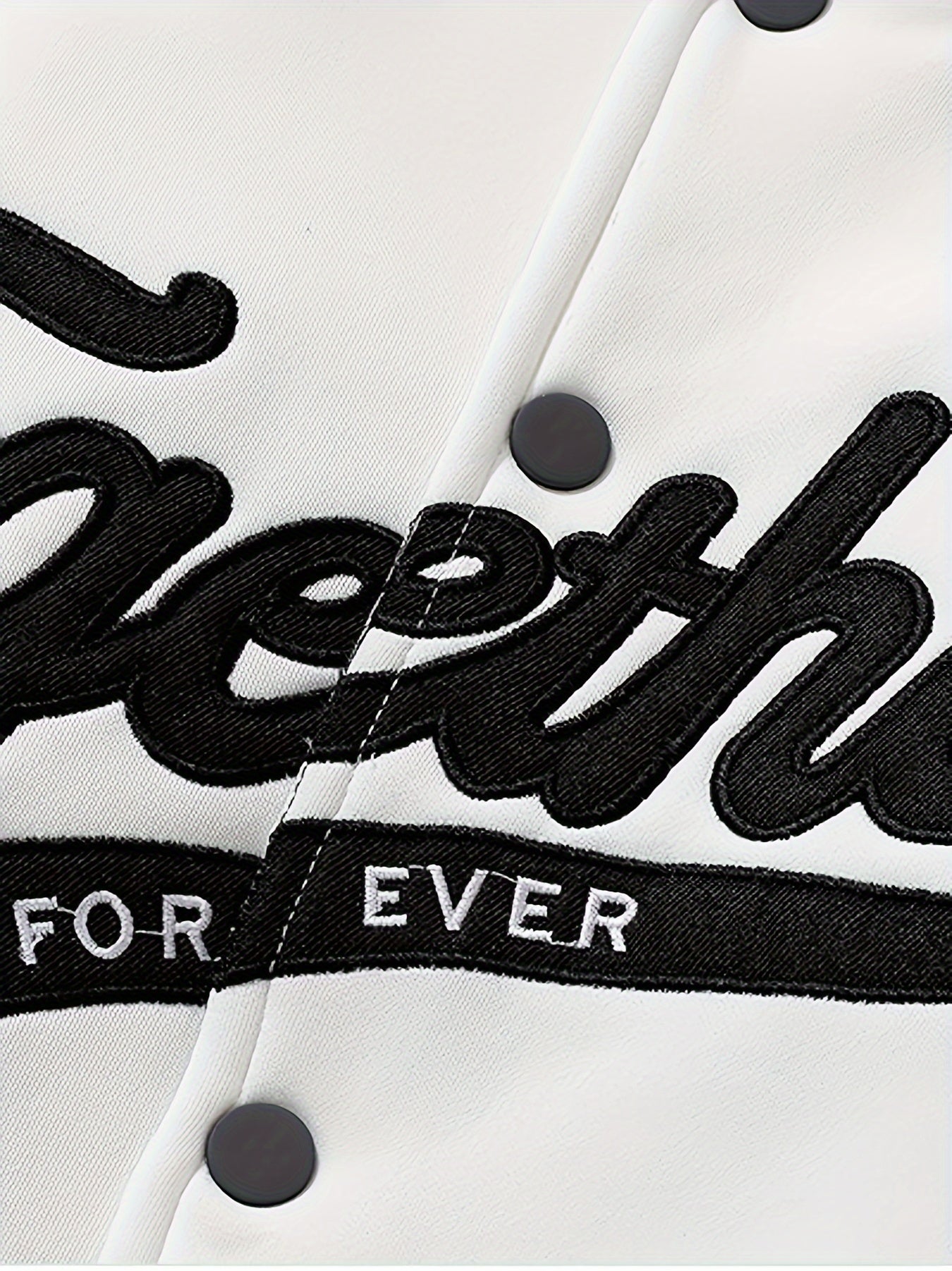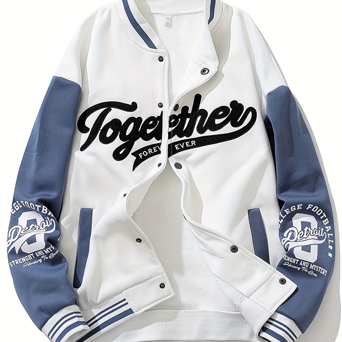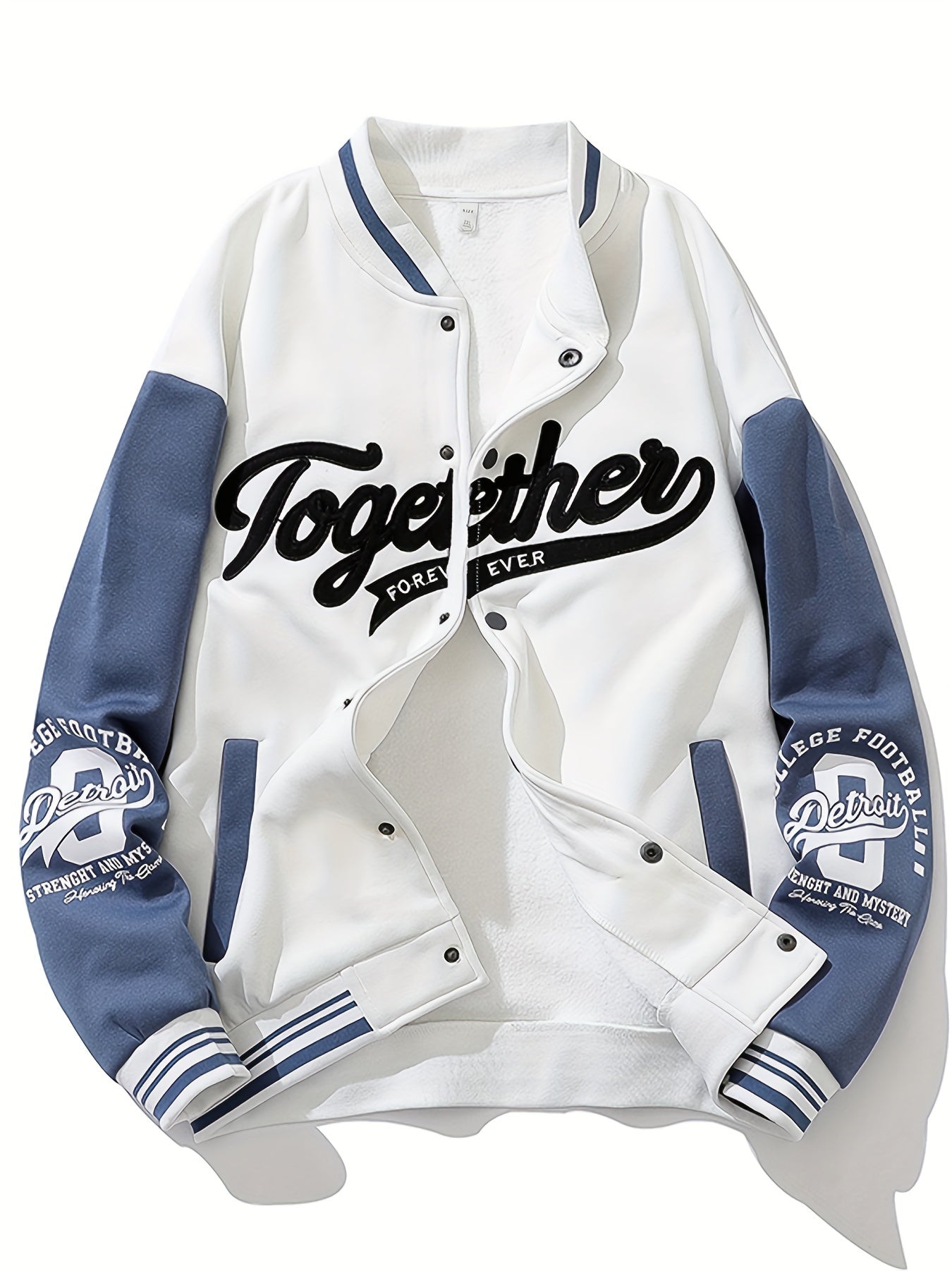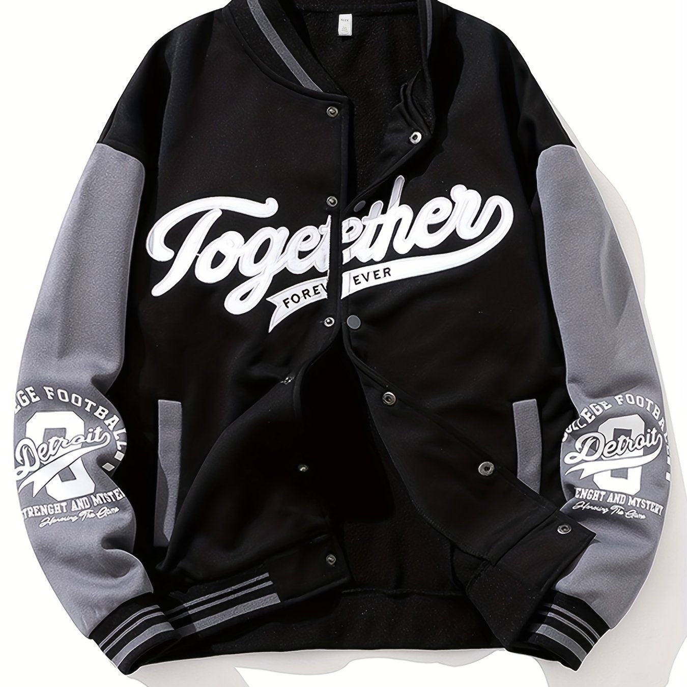 Chaqueta de béisbol de manga larga con botones y cuello alto con bordado de letras TOGETHER FOREVER para hombre, estilo universitario de primavera y otoño, versátil para exteriores y uso deportivo