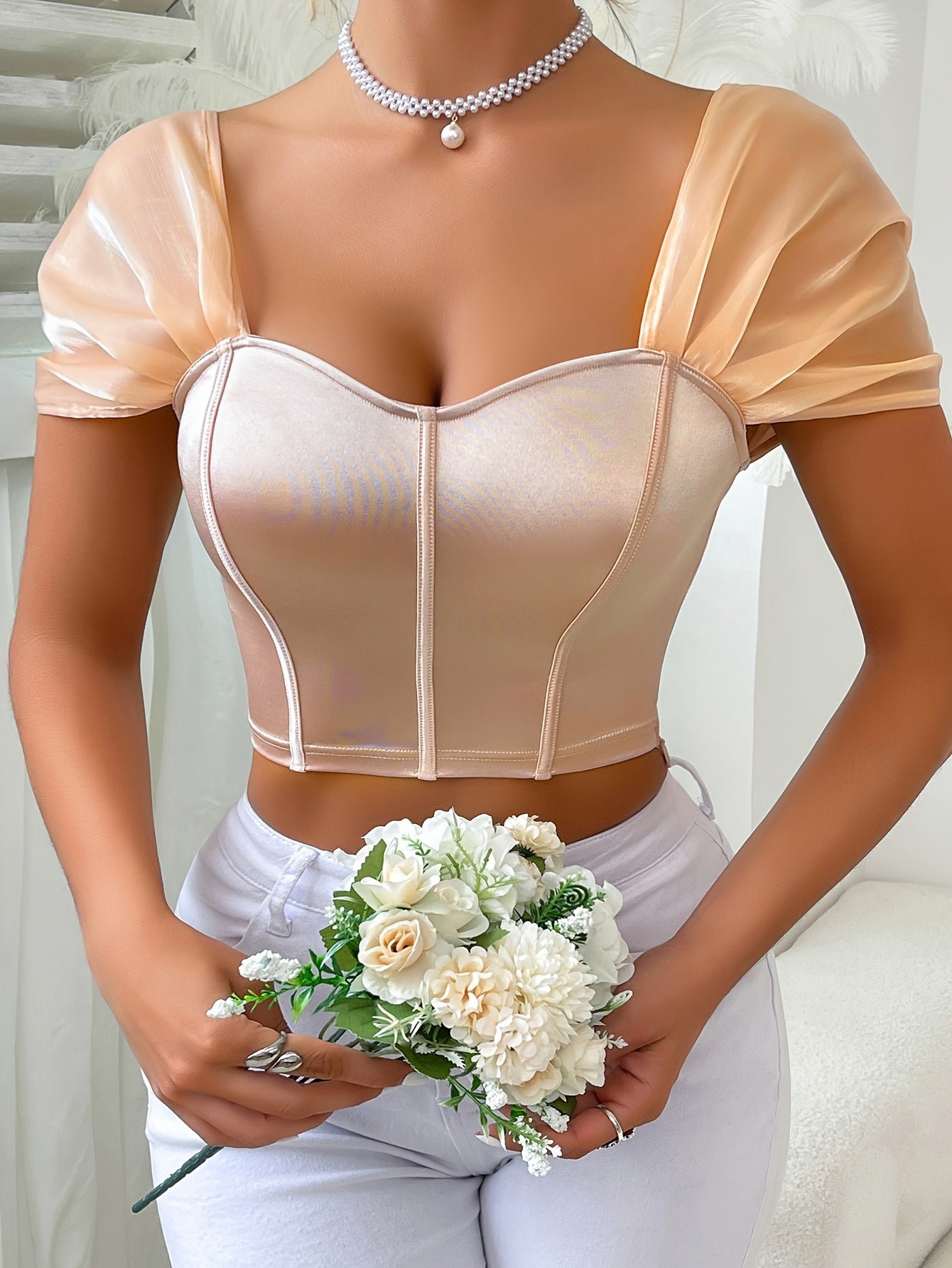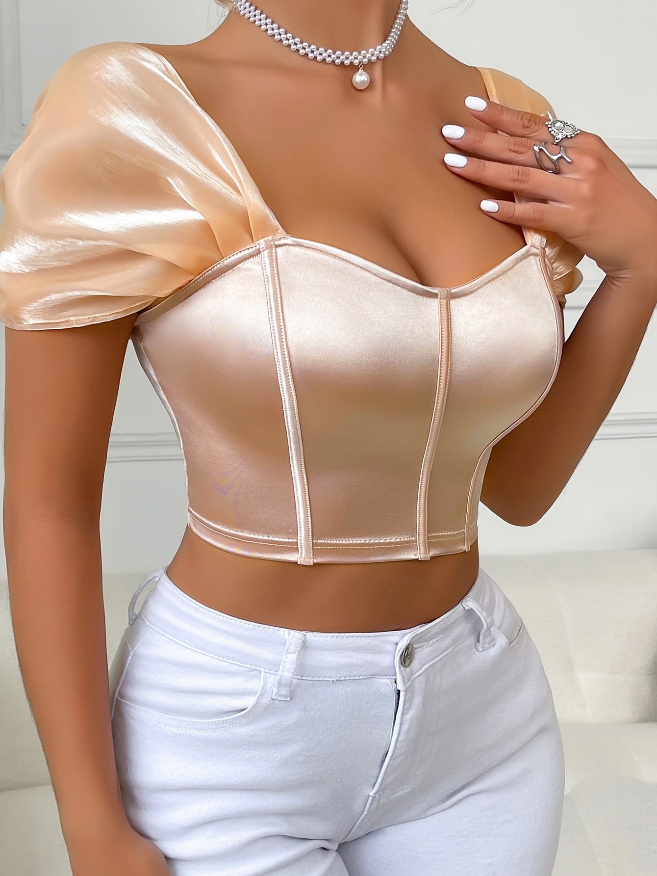 Top corto de satén con mangas abullonadas, bustier sexy con espalda descubierta y cremallera para mujer