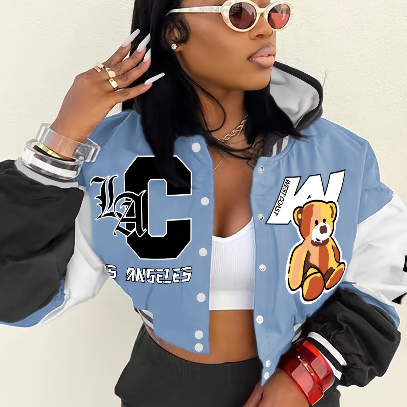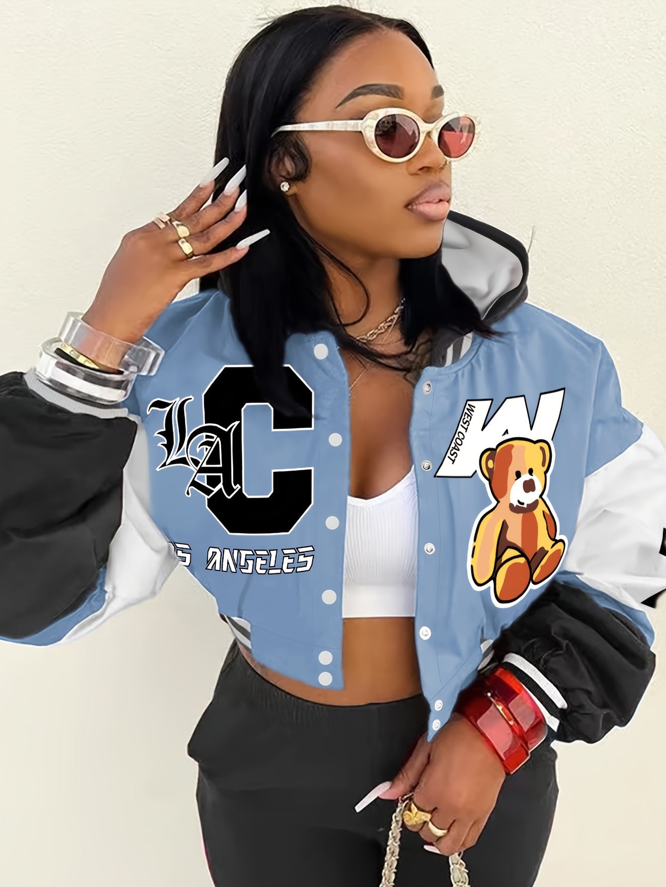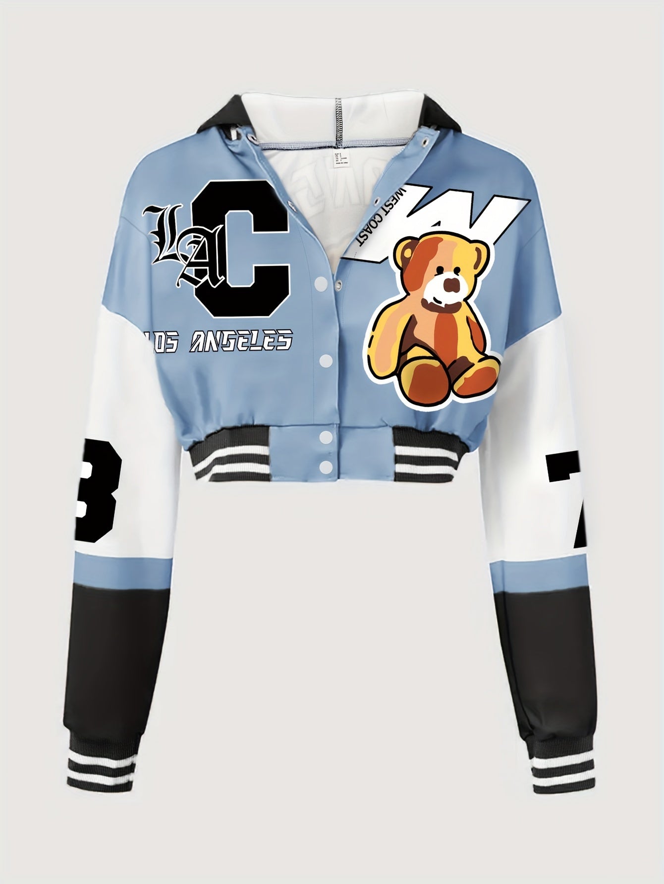 Chaqueta informal con capucha para mujer con estampado de osos y letras: abotonada, manga larga, mezcla de poliéster, lavable a máquina; perfecta para primavera/otoño