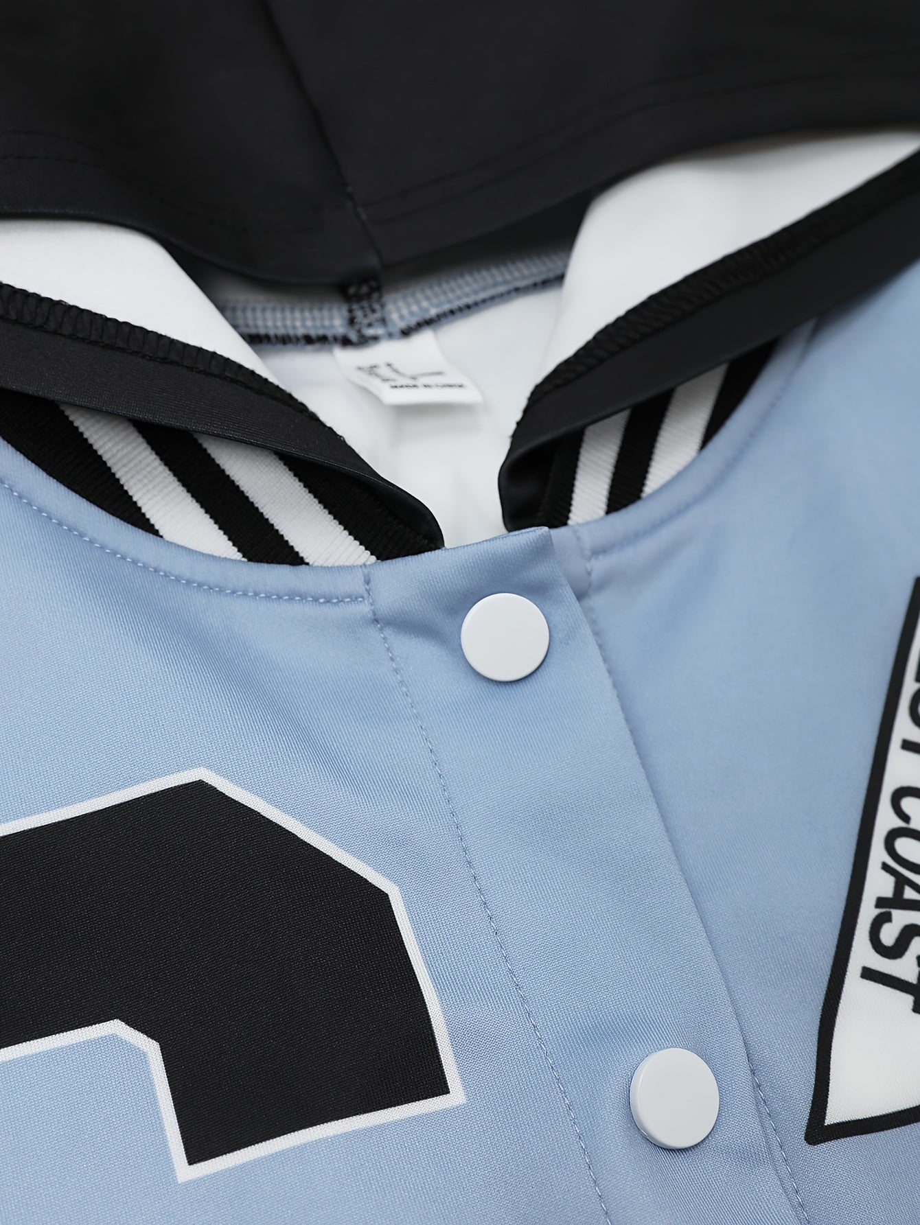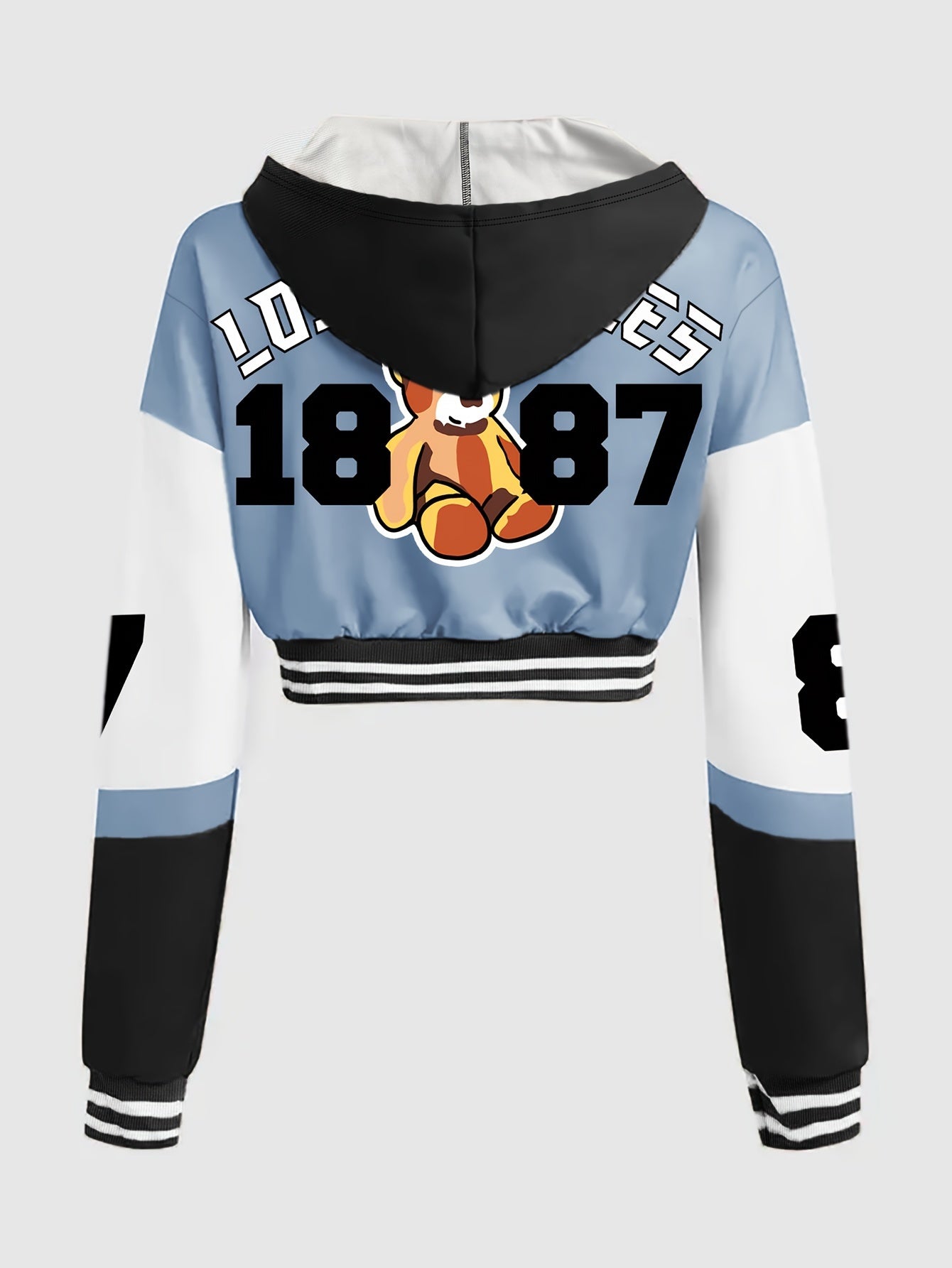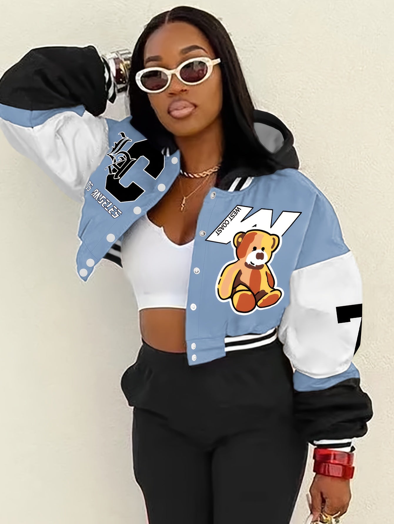Chaqueta informal con capucha para mujer con estampado de osos y letras: abotonada, manga larga, mezcla de poliéster, lavable a máquina; perfecta para primavera/otoño