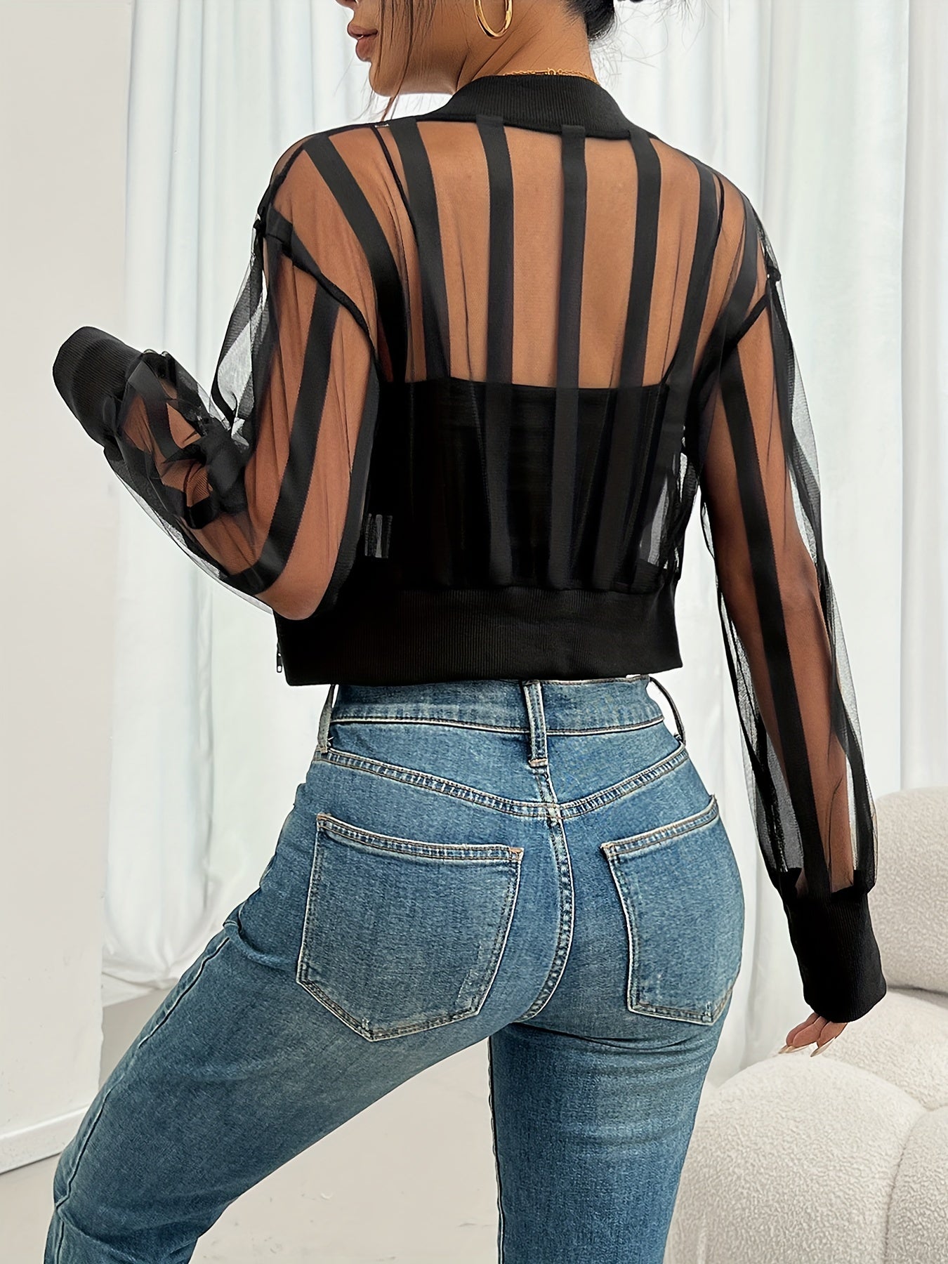 Chaqueta de malla transparente con cremallera, elegante blusa de rayas de manga larga para primavera y verano, ropa de mujer